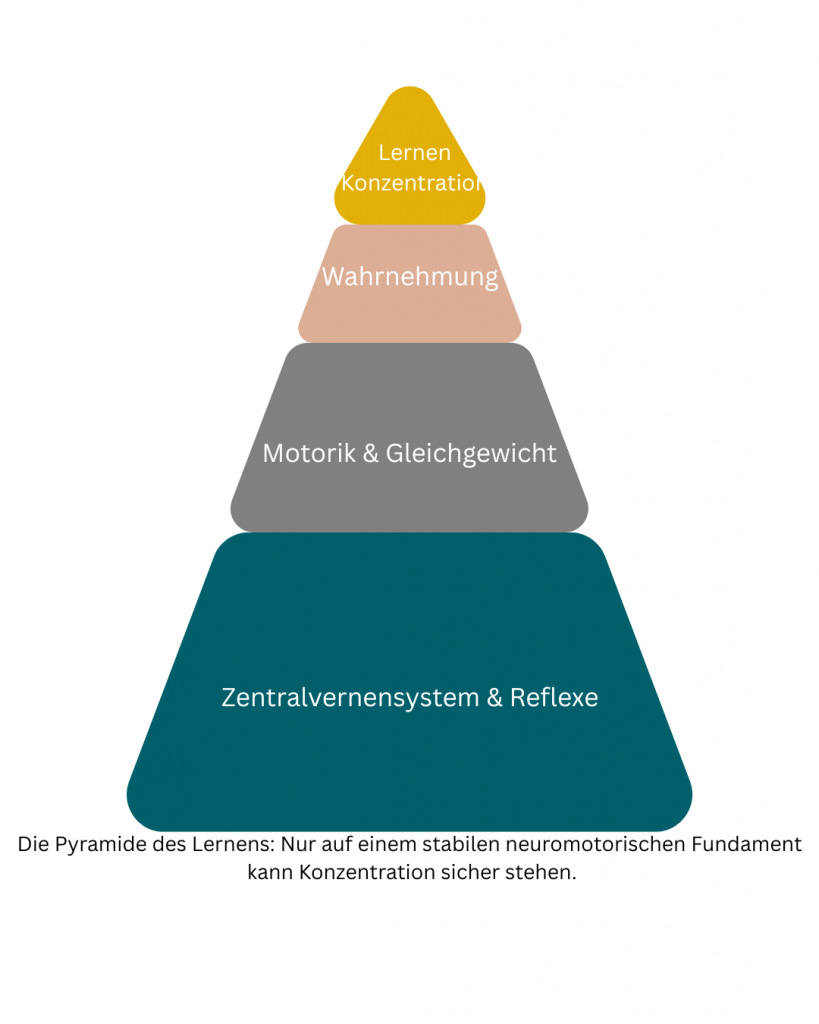 Um sich konzentrieren zu können, benötigt das Gehirn ein stabiles Fundament. Ist das zentrale Nervensystem jedoch noch nicht voll ausgereift, bleibt das Kind in frühen Überlebensprogrammen – den sogenannten frühkindlichen Reflexen – „hängen.“